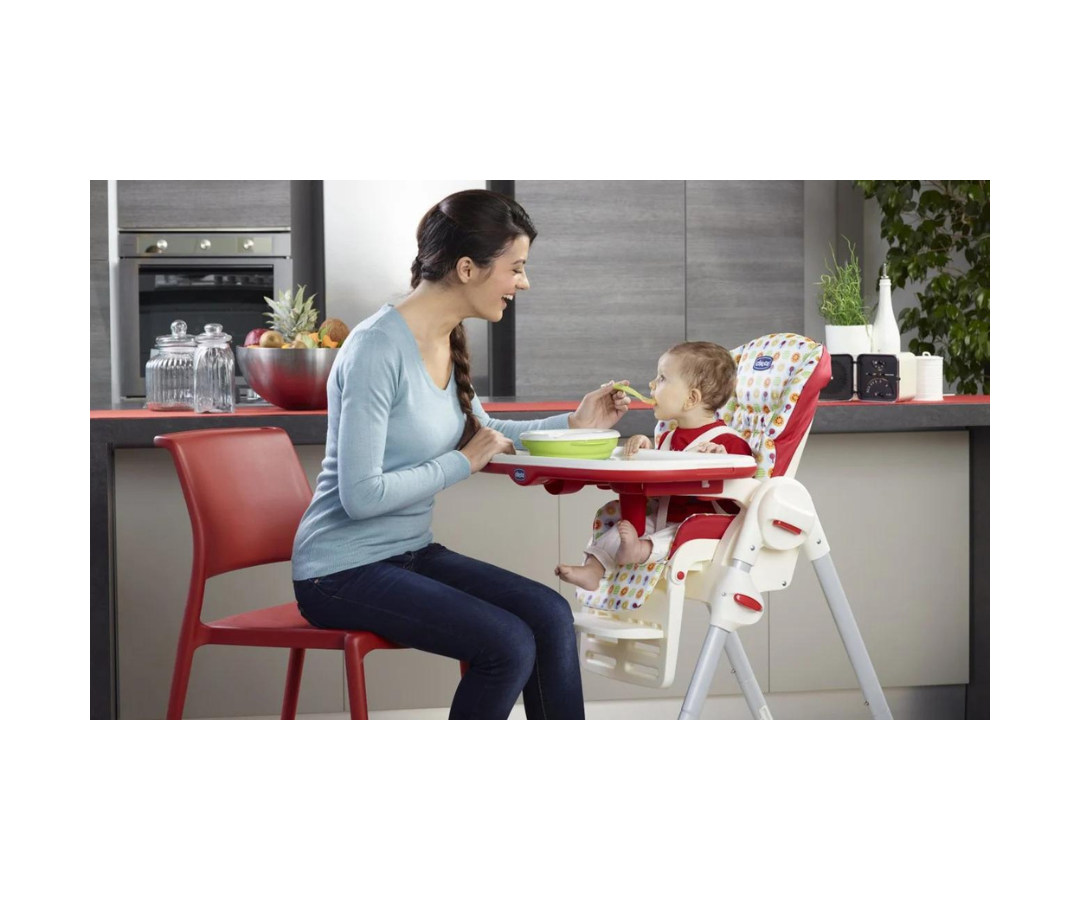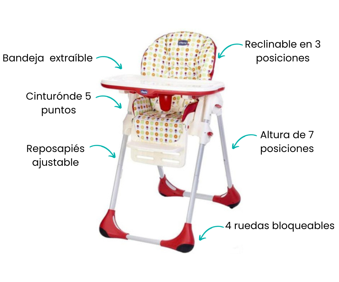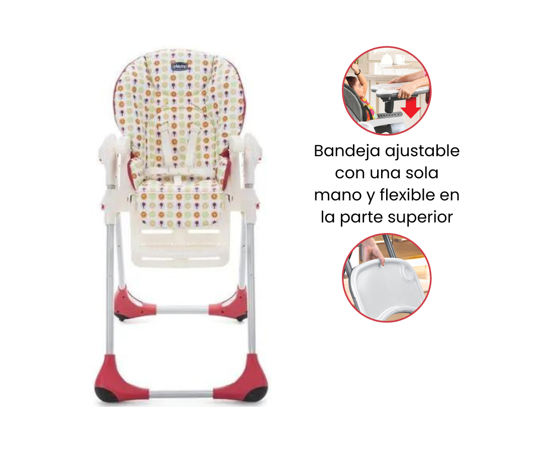 Se destaca por ser compacta una vez plegada, facilitando su almacenamiento. Además, su bandeja para la hora de comer es ajustable con una sola mano y flexible en la parte superior, es fácil de limpiar y puede acoplarse a las patas traseras cuando no está en uso.