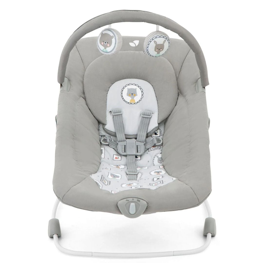 Movimiento suave y vibración en dos velocidades para calmar al bebé con asiento reclinable y juguetes.
