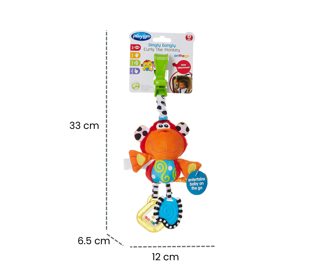 Un bonito mono de peluche con pinza para colgar del cochecito o del asiento del coche de bebé. Esta encantadora compañía está diseñada para promover el desarrollo de la coordinación desde el nacimiento. Ideal para estimular la vista, el oído y el tacto de tu bebé, este mono de peluche ofrece colores vibrantes, texturas suaves y sonidos alegres para una experiencia sensorial completa.