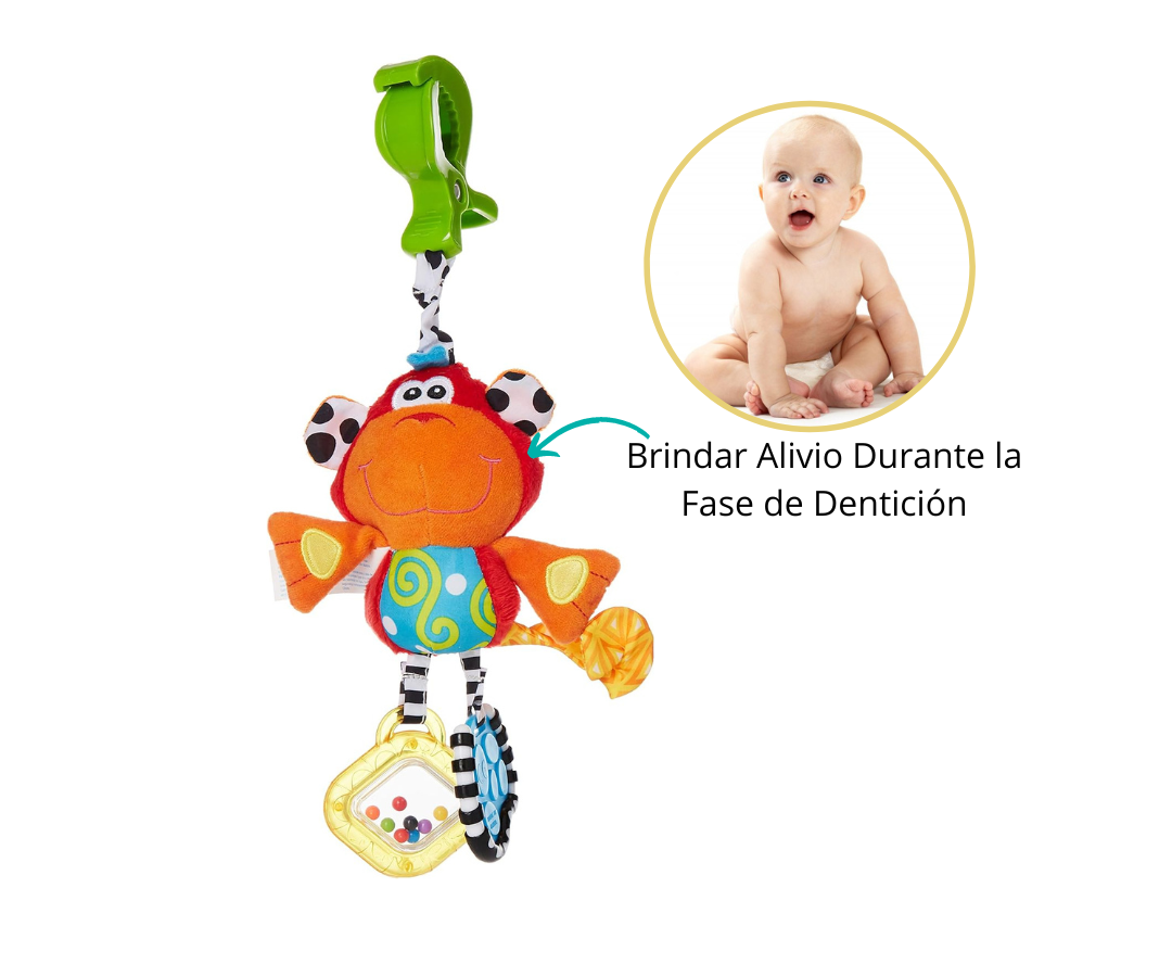 Chasquidos juguetones del mono que cuenta con un anillo de dentición incorporado en la pata para brindar alivio durante la fase de dentición. Con este compañero lúdico, tu bebé no solo disfrutará de sonidos entretenidos, sino que también encontrará consuelo en cada mordida, haciendo que la diversión y el alivio vayan de la mano en sus aventuras diarias.