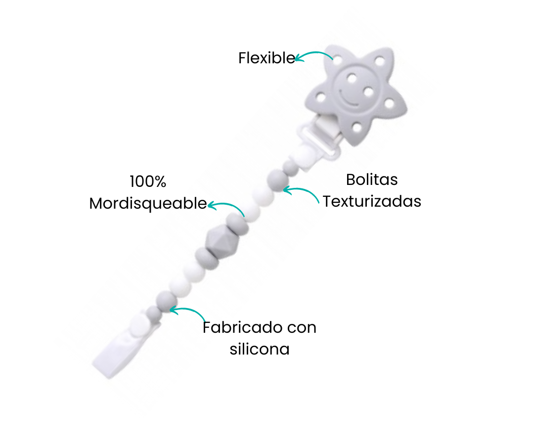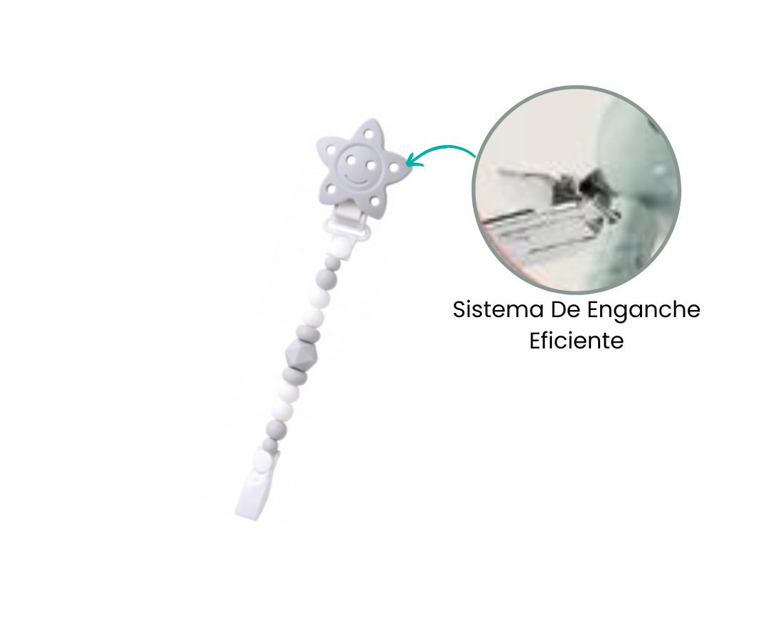 Diseñado para garantizar un agarre seguro y cómodo del chupete de tu bebé. Con un sistema de enganche eficiente, ofrece tranquilidad al evitar pérdidas accidentales. Su diseño ergonómico y fácil de usar lo convierte en el accesorio perfecto para padres ocupados.
