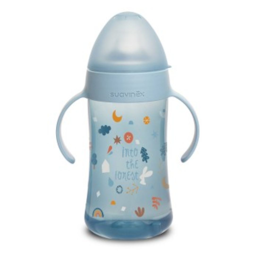 Biberón Suavinex entreno +4m, 270ml, asas, boquilla silicona anticólicos. Fácil transición a taza.