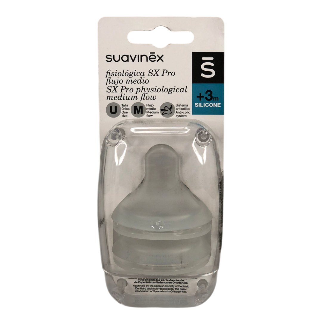 Tetina fisiológica de silicona, flujo medio, para 3 meses a más, sistema anti cólico.
