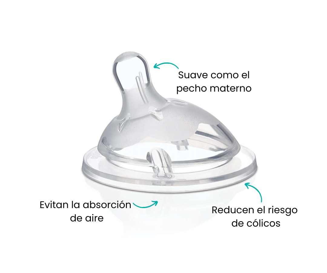 Tetina de flujo medio recomendada a partir de los 2 meses, cuando el bebé succiona con más fuerza. Diseñada específicamente para recién nacidos, su inclinación única ayuda a mantenerla siempre llena de leche, previniendo la ingesta de aire. Además, facilita mantener el cuello del bebé en la posición correcta durante la alimentación