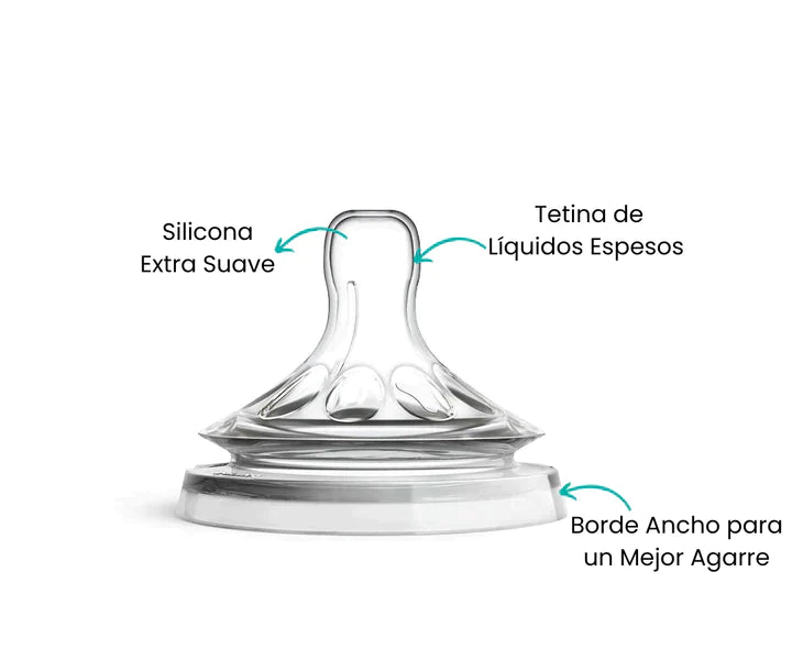 La tetina ultra suave de este biberón imita de manera sorprendente la forma y sensación del pecho materno. Su amplio diseño, modelado a semejanza del pezón, garantiza un agarre natural y confortable para tu bebé