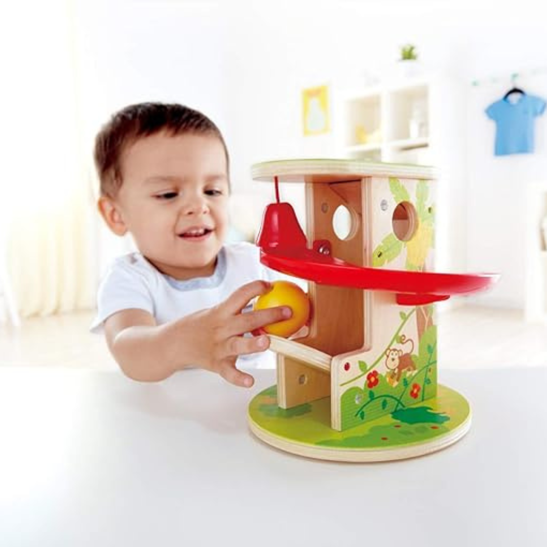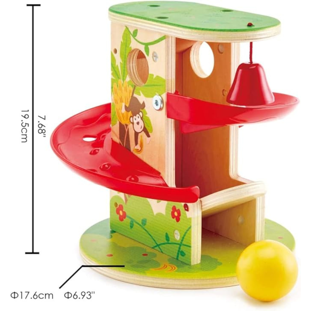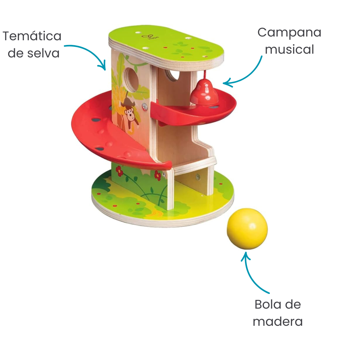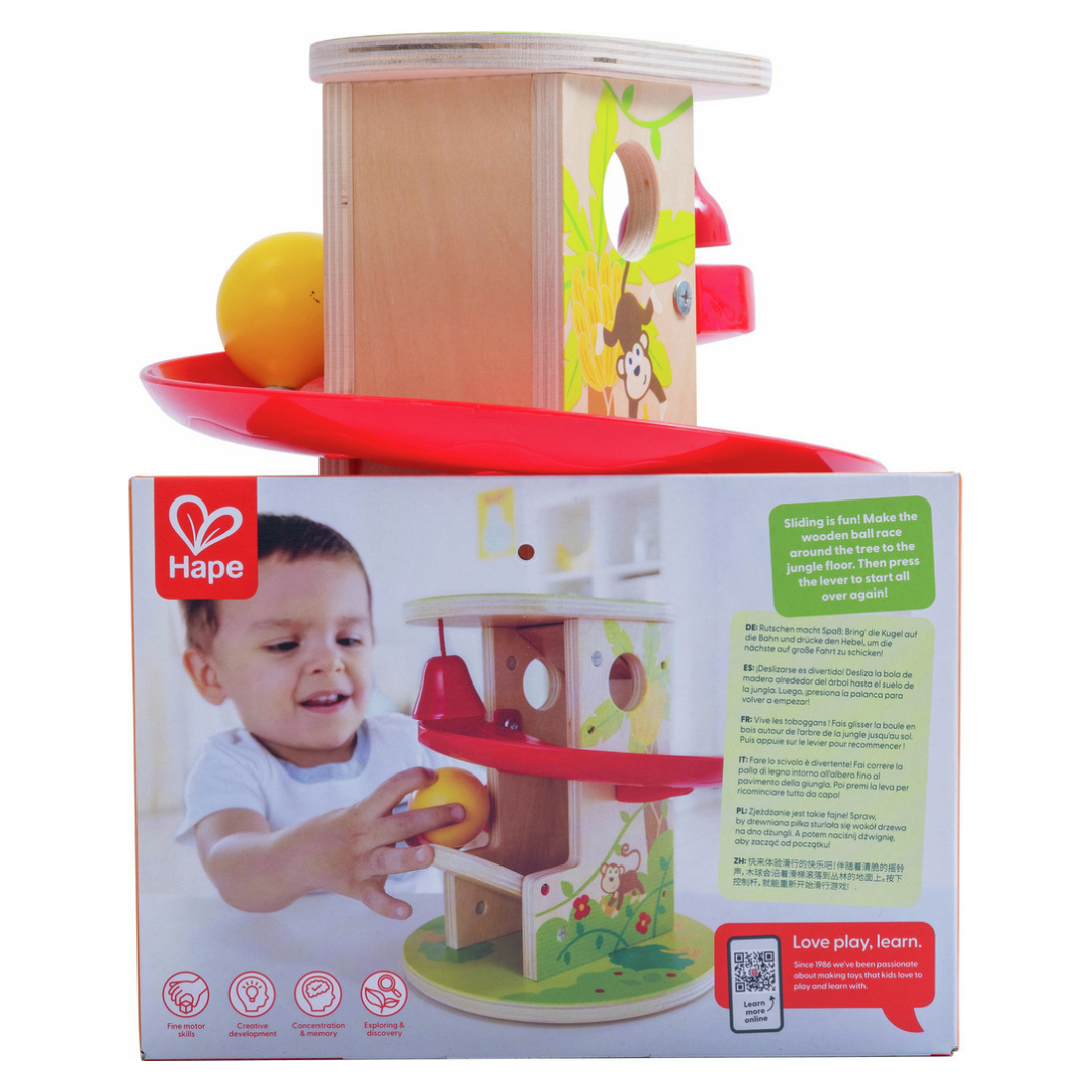 Hape Jungle Press and Slide es todo sobre diversión interactiva. Haz que la bola de madera corra alrededor de la copa del árbol hasta el suelo de la junglSuena una campana al comienzo de cada circuito.