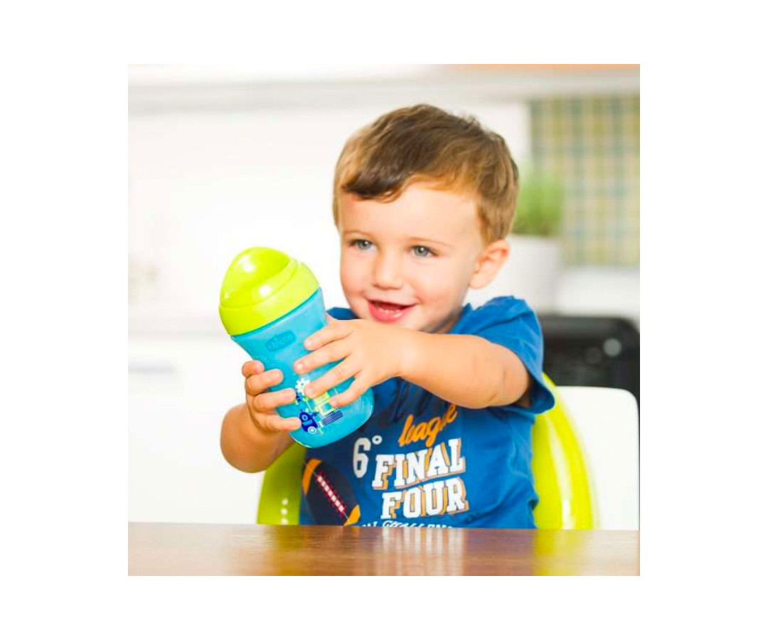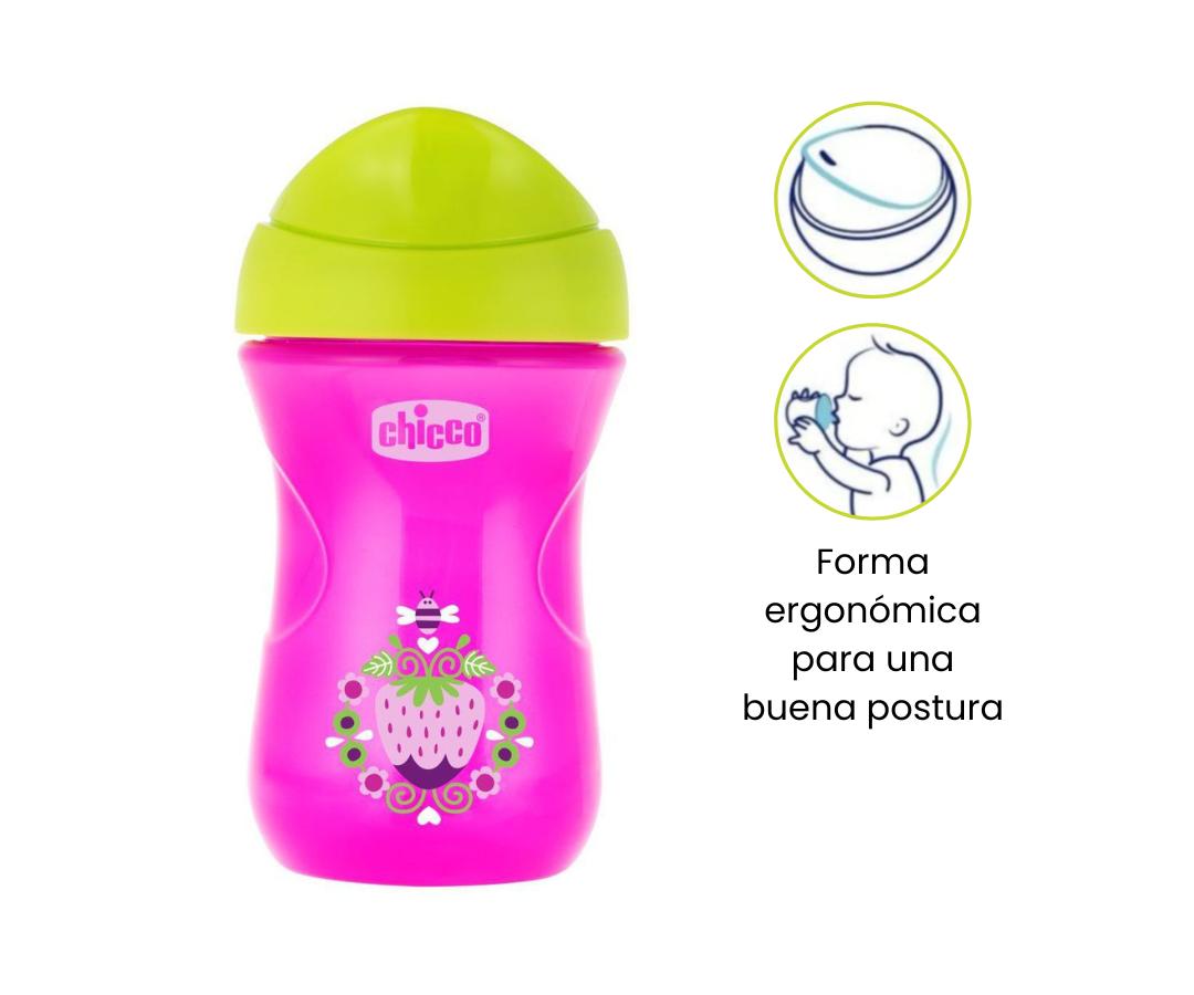 La forma ergonómica del vaso y la curva estratégica en la tapa ayudan a una buena postura y la posición adecuada de la nariz del bebé mientras bebe, asegurando una experiencia sin obstrucciones y una respiración cómoda. Además, el sistema con válvula antiderrames, ofrece un control eficaz sobre la succión, evitando derrames innecesarios.