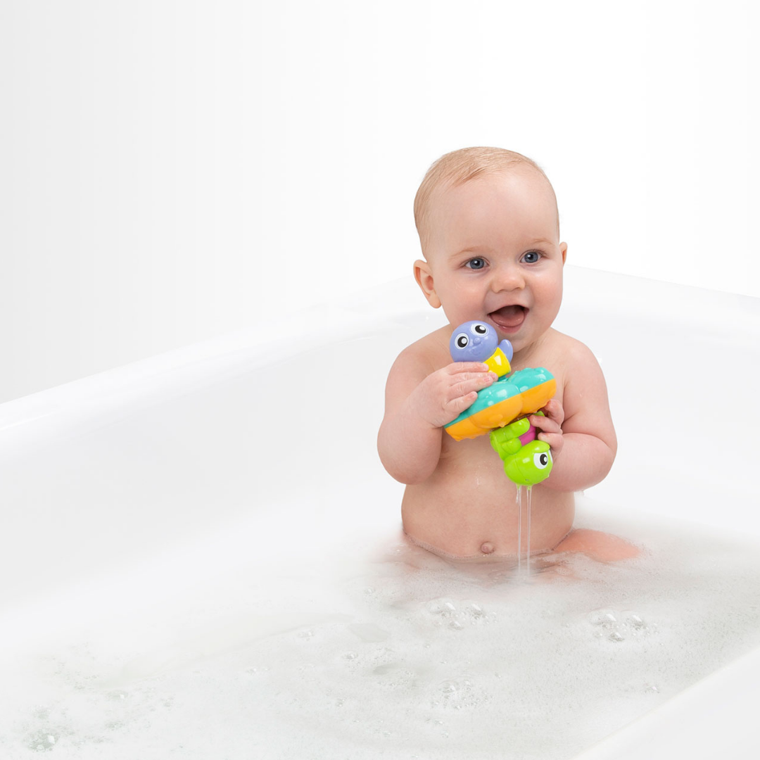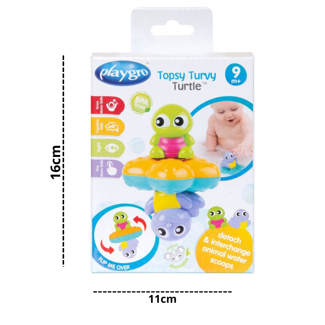 El bebé se divertirá muchísimo a la hora del baño volteando a la Tortuga Topsy Turvey para revelar una foca, lo que fomenta el juego imaginativo y la exploración acuática. Dos personajes intercambiables permiten al bebé recoger y verter agua, o agitar la base de estrella de mar para disfrutar de los divertidos sonidos del sonajero. Este juguete flotante estimula la vista, el oído y el tacto del bebé, y promueve la coordinación ojo-mano y el desarrollo motor.