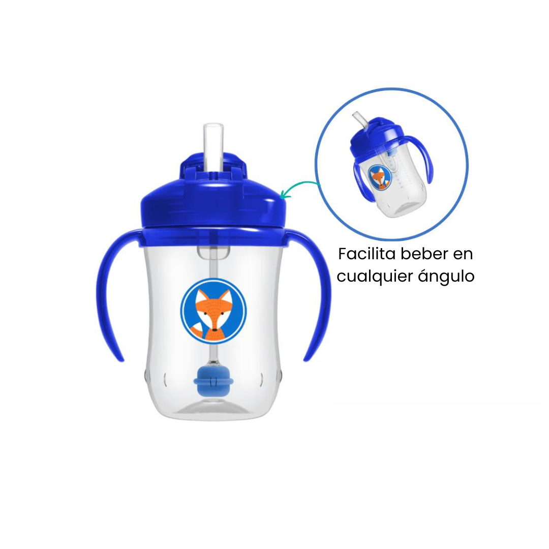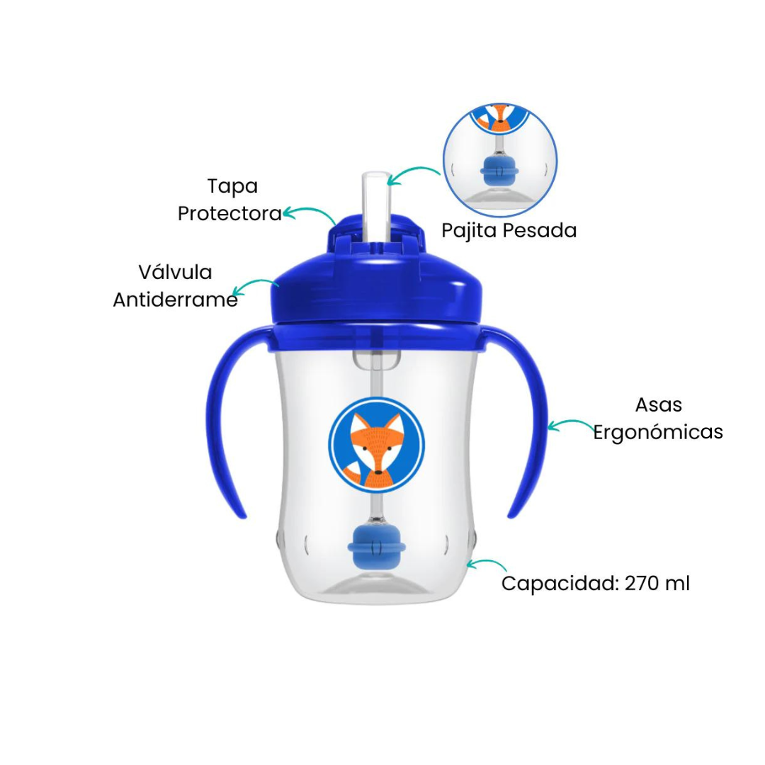 El vaso de 9 oz. con es perfecto para bebés a partir de los 6 meses. Su diseño innovador con sorbete suave y ponderado facilita la transición de inclinar el vasito boca abajo a beber en posición vertical, sin derrames y con comodidad.