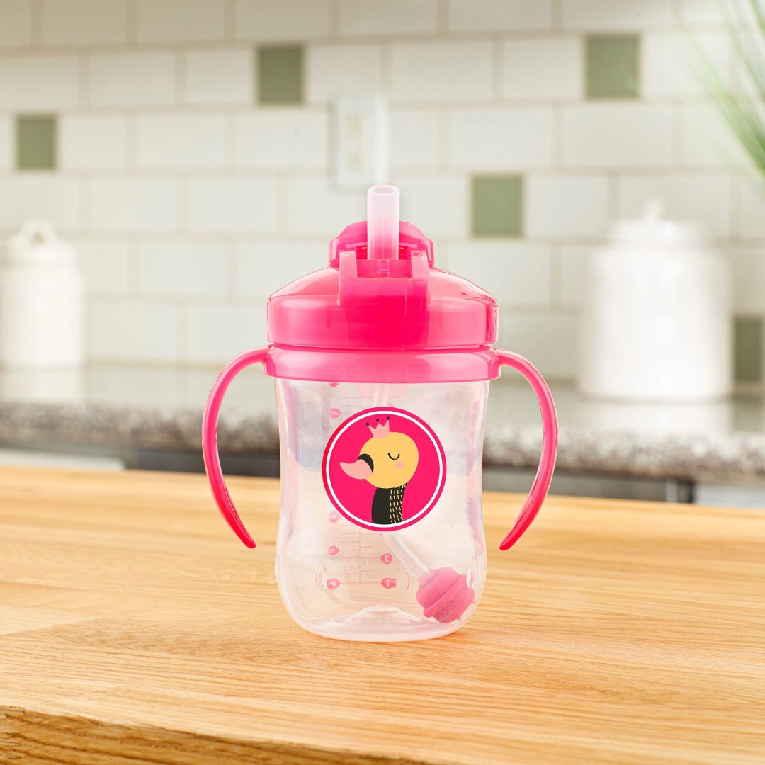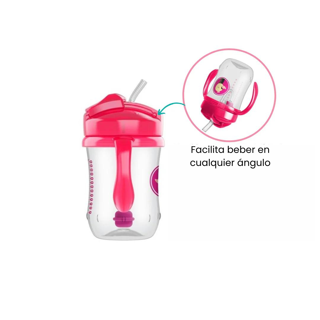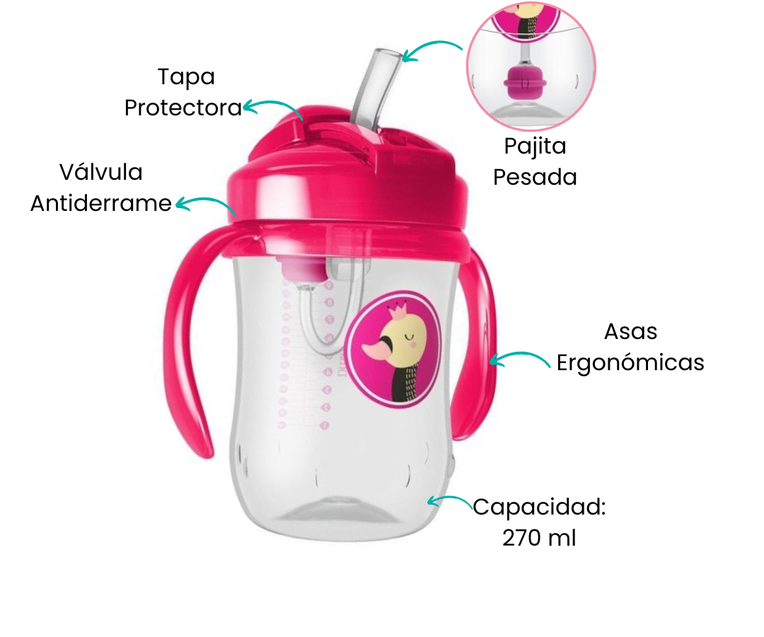 El vaso de 9 oz. con es perfecto para bebés a partir de los 6 meses. Su diseño innovador con sorbete suave y ponderado facilita la transición de inclinar el vasito boca abajo a beber en posición vertical, sin derrames y con comodidad.
