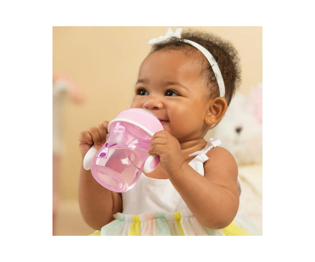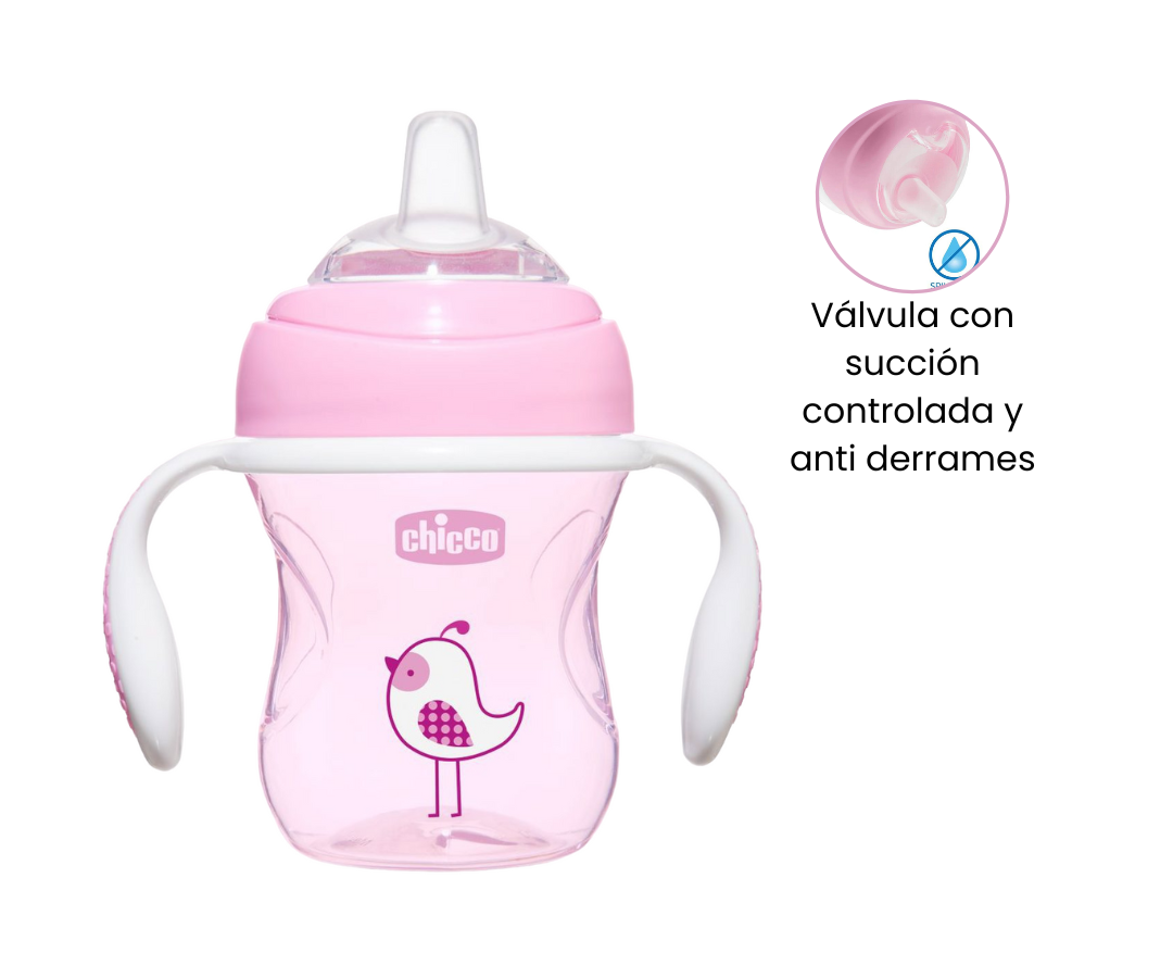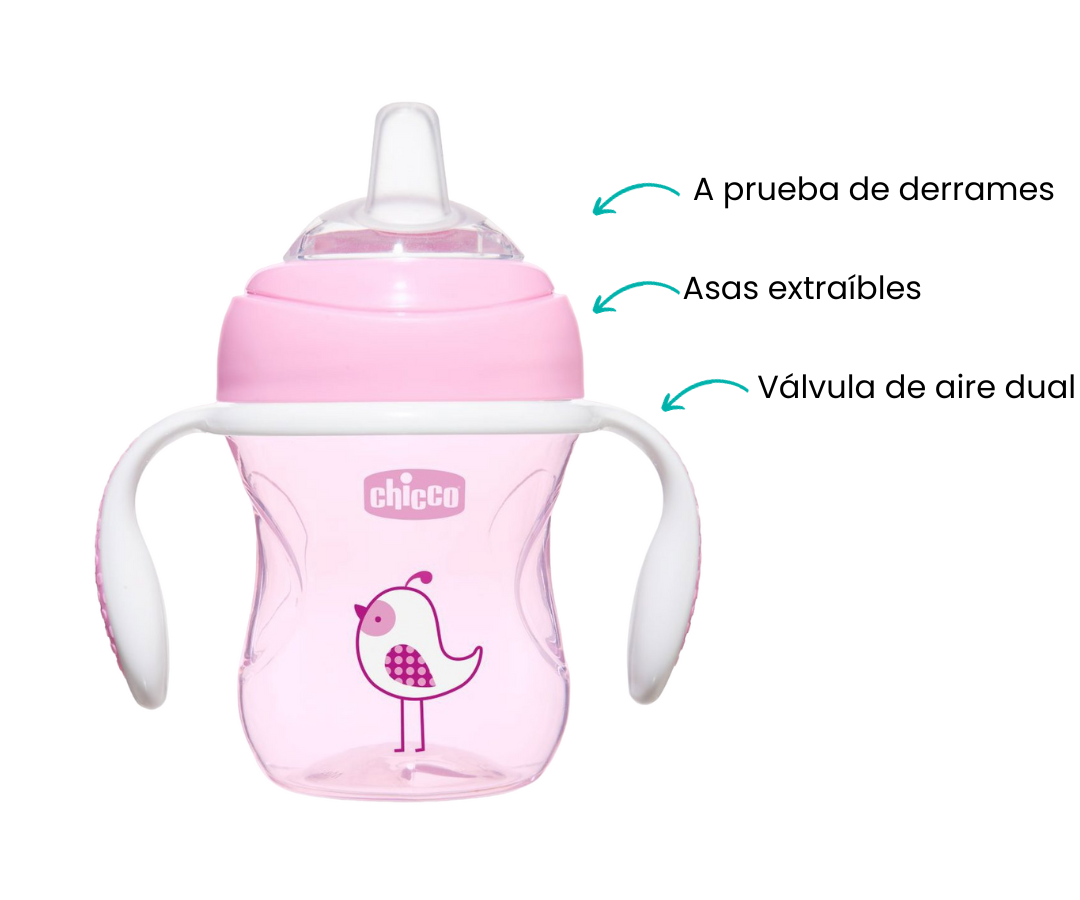 Este vaso ayuda a la transición del pecho o biberón al primer vaso, se presenta como un modelo a prueba de derrames con asas extraíbles que facilitan su sujeción. Además, la boquilla fomenta una postura adecuada del cuello al beber, promoviendo así el desarrollo saludable del pequeño.
