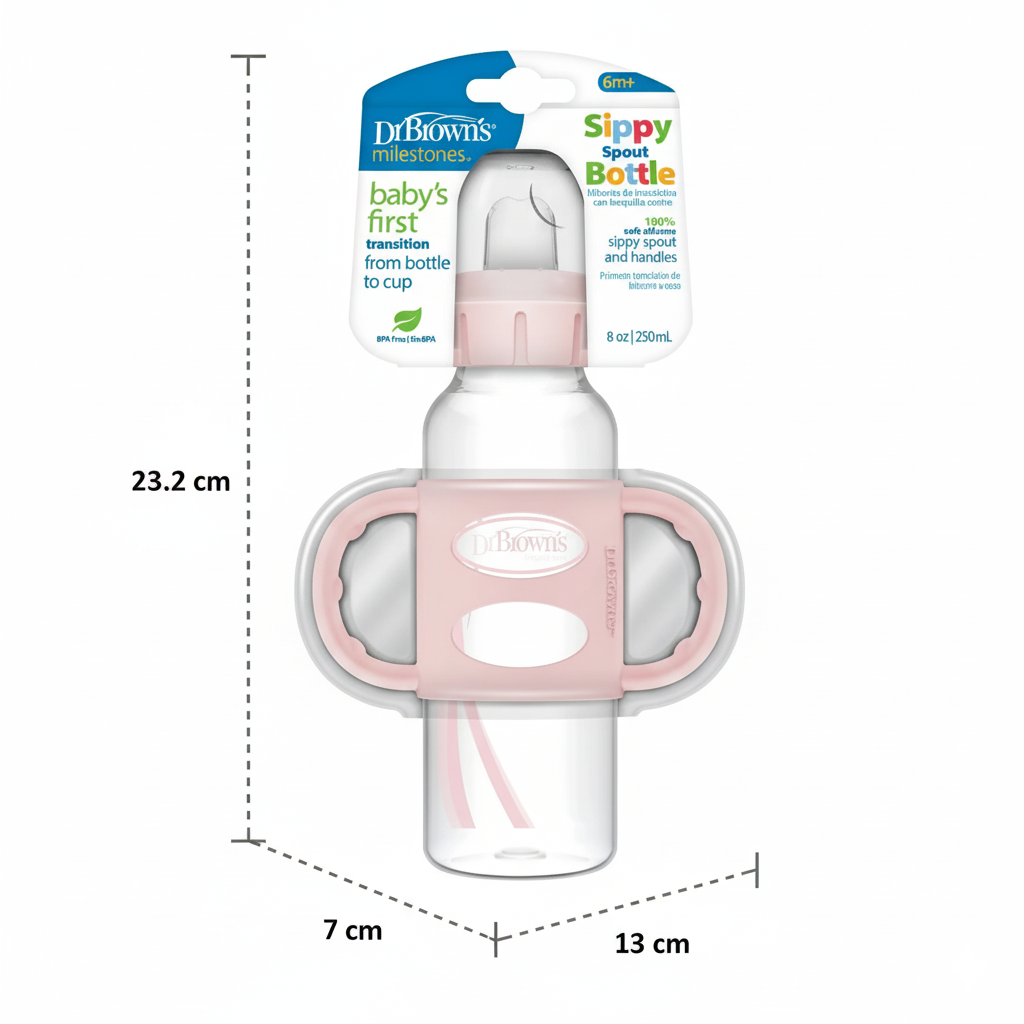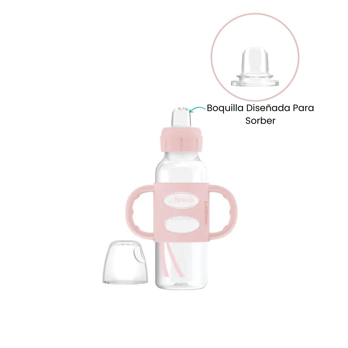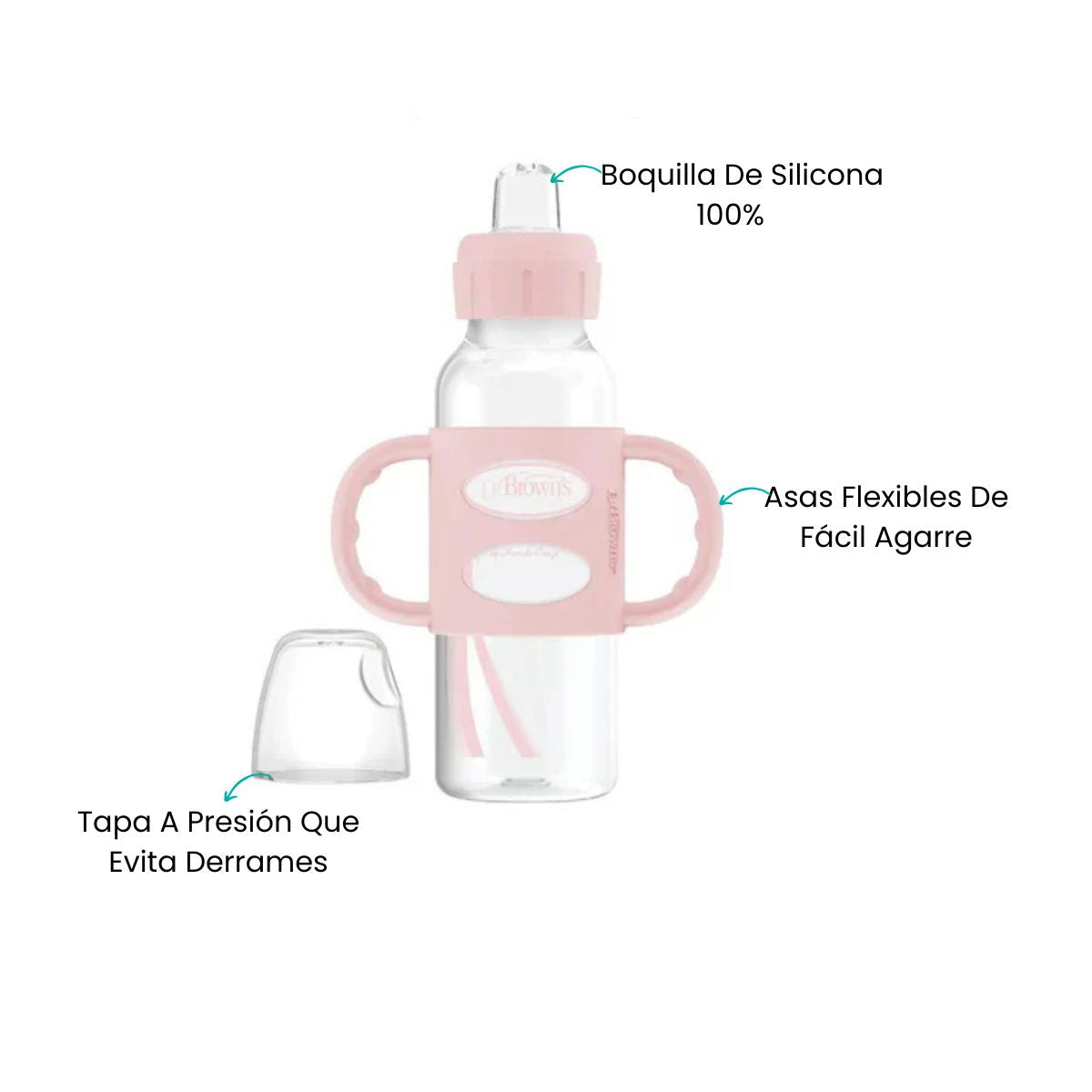 Transición sin preocupaciones con el Biberón de Transición con Asas Dr. Brown's, diseñado para fomentar la independencia en la alimentación. Su forma ergonómica permite un agarre cómodo y seguro para las manos pequeñas del bebé. Las asas ayudan a desarrollar habilidades motoras gruesas y finas durante el uso diario. La tetina suave proporciona una experiencia de alimentación natural y tranquila. Ideal para acompañar el paso del biberón tradicional a la bebida autónoma.