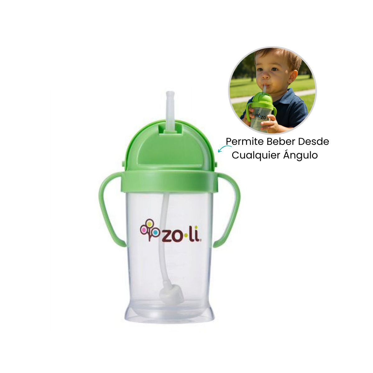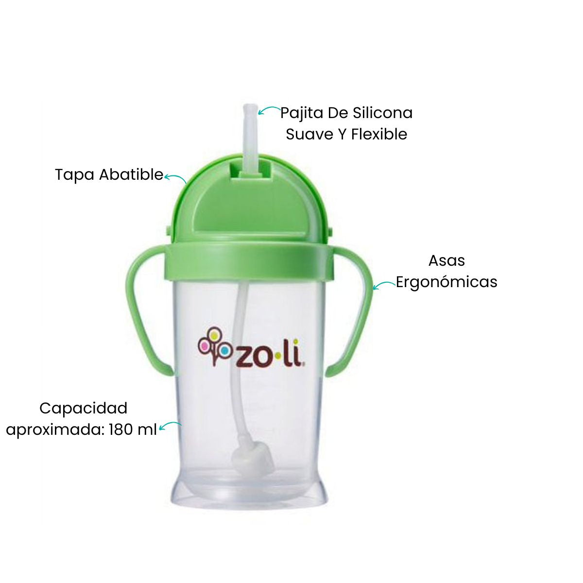 Este vaso con sorbete ZoLi está diseñado para acompañar a tu pequeño en su transición del biberón al vaso común, de manera cómoda y natural. Su pajilla suave y flexible permite beber sin esfuerzo, protegiendo dientes y encías sensibles. El diseño ergonómico facilita el agarre por manos pequeñas, fomentando la independencia al momento de tomar agua. Además, su tapa asegura un cierre higiénico y práctico para llevar a todas partes. Ideal para usar en casa, guardería o paseos diarios.Vaso con Sorbete Verde ZoLi: Hidratación Fácil y Divertida