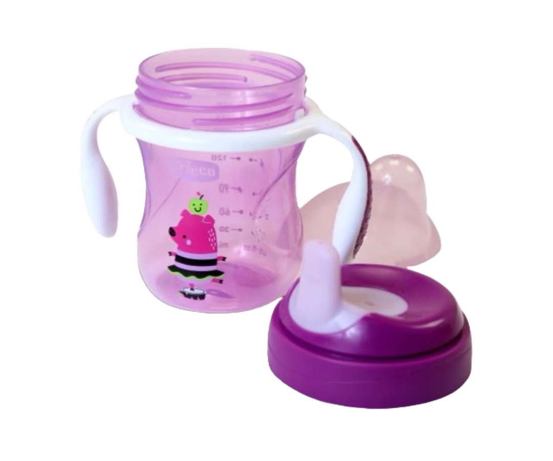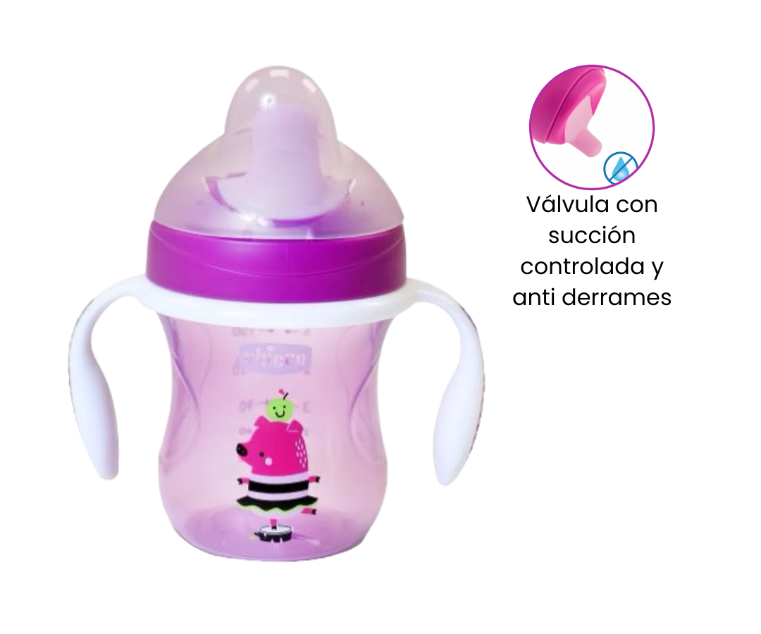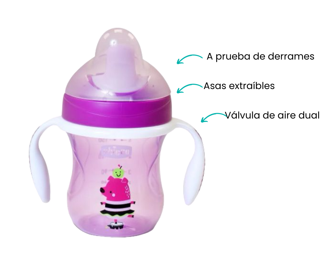 Este vaso ayuda a la transición del pecho o biberón al primer vaso, se presenta como un modelo a prueba de derrames con asas extraíbles que facilitan su sujeción. Además, la boquilla fomenta una postura adecuada del cuello al beber, promoviendo así el desarrollo saludable del pequeño.