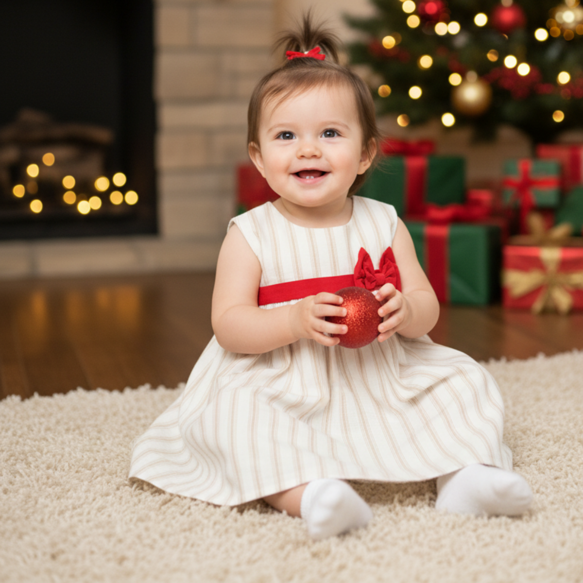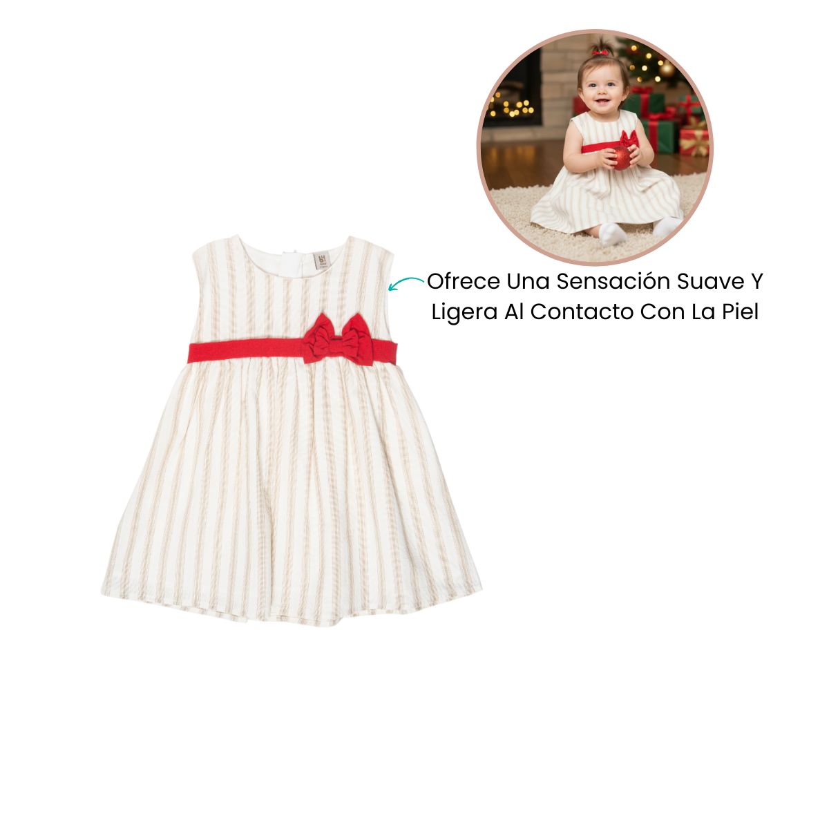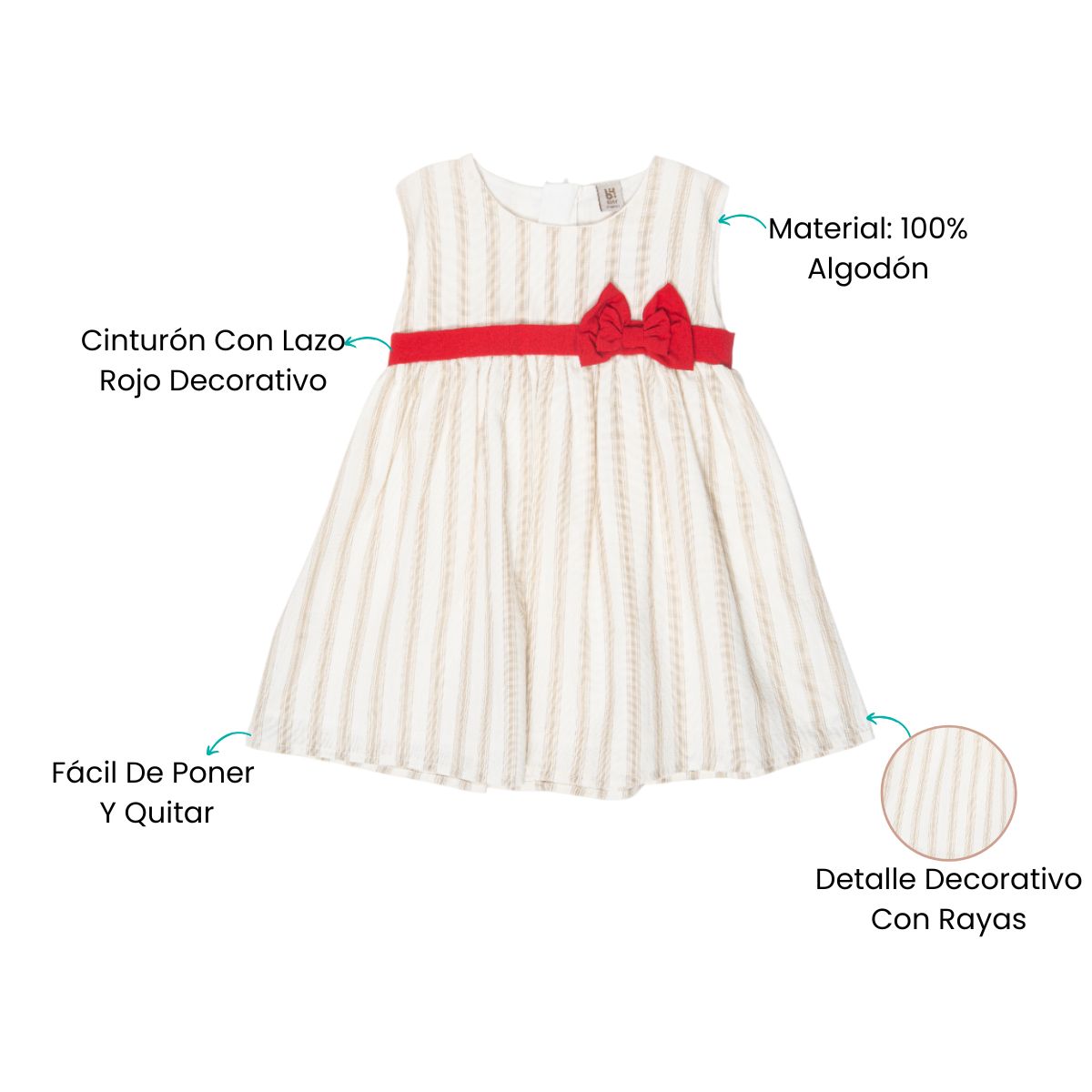 Este adorable vestido beige con rayas y cinturón rojo con lazo combina elegancia y dulzura en una prenda ideal para las ocasiones más especiales. Su diseño atemporal y delicado realce en la cintura aportan un estilo encantador, perfecto para días festivos, reuniones familiares o paseos en los que tu pequeña destaque con ternura y frescura.