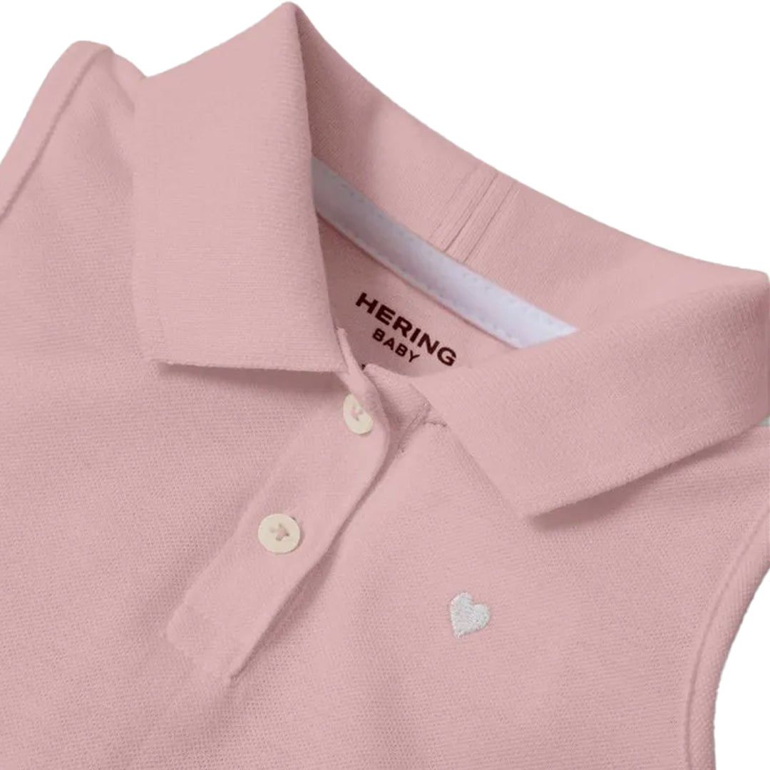 Body bebé niña Hering Kids, confeccionado en punto de algodón. Esta pieza tiene un diseño de camiseta sin mangas, cuello tipo polo con dos aberturas para botones, abertura debajo del pecho dejando un efecto ligeramente redondeado y cierre en la entrepierna con botones a presión.
