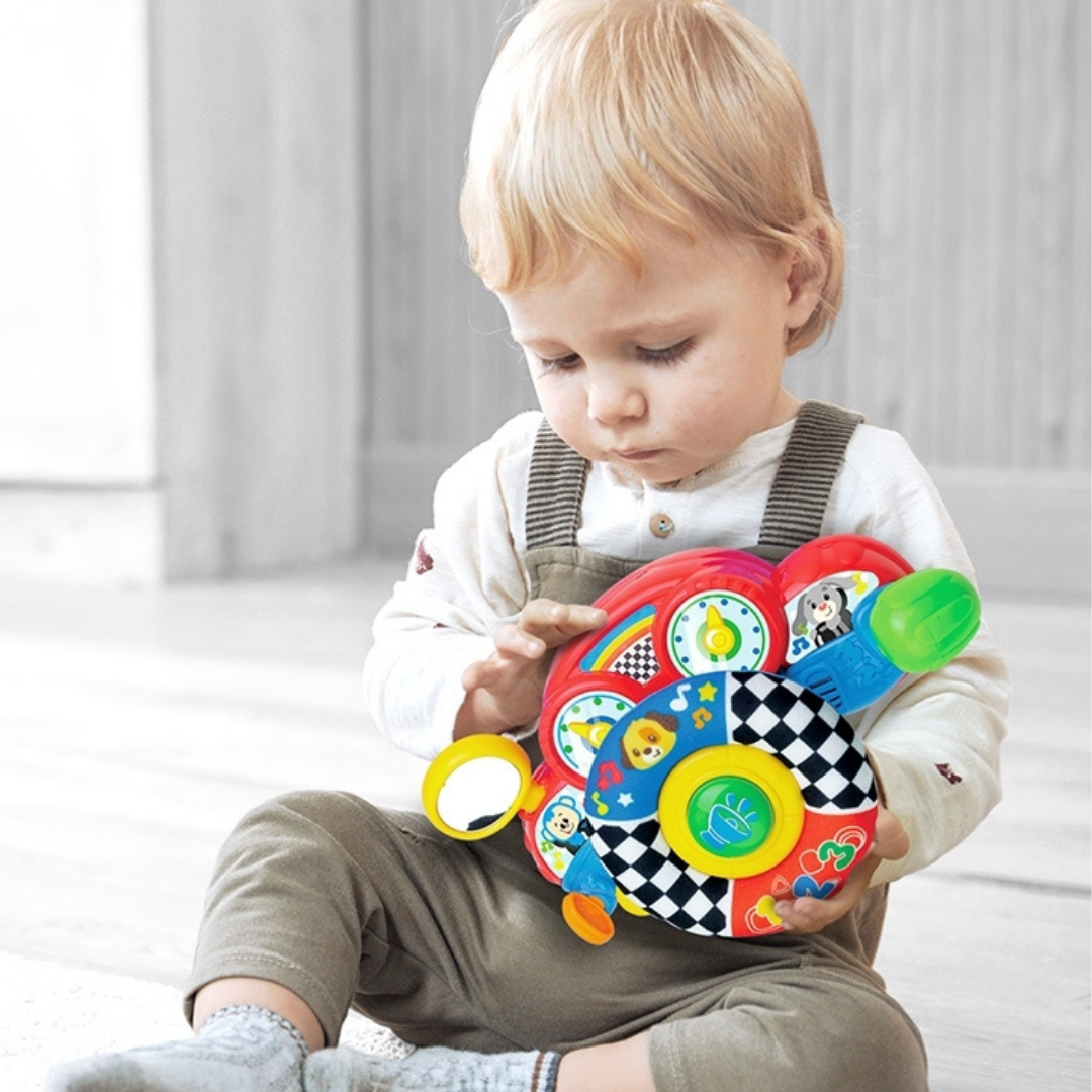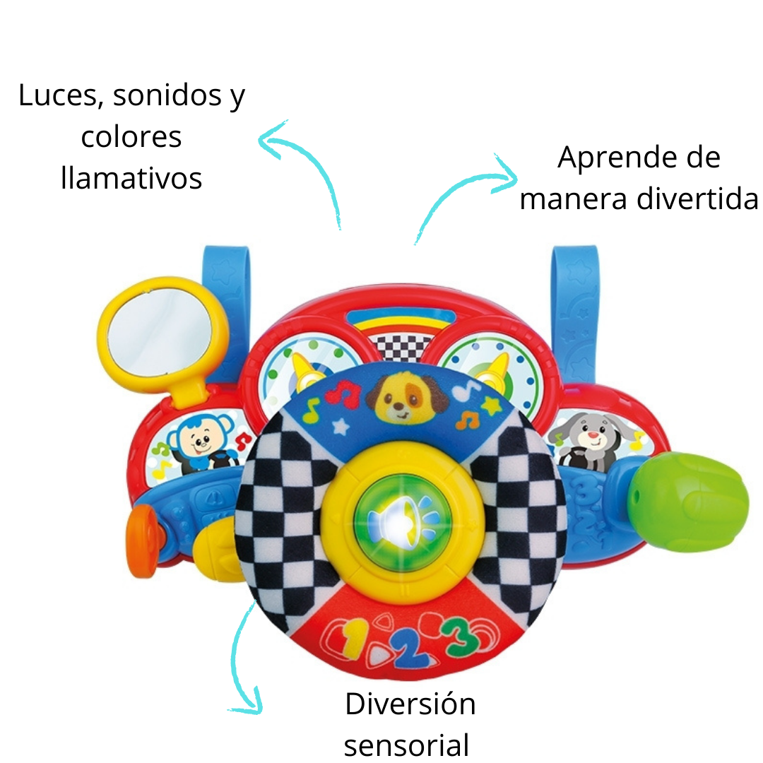 Funciones: volante con claxon que gira 360º, cambio de marchas y llave de encendido que emiten melodías, sonidos y efectos realistas, frases divertidas en español. Favorece la estimulación sensorial y desarrolla la coordinación ojo-mano y la comprensión causa-efecto